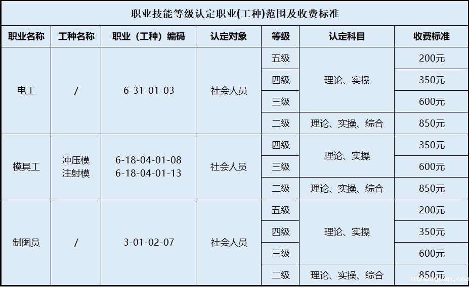 二、职业技能等级认定职业(工种)范围及收费标准