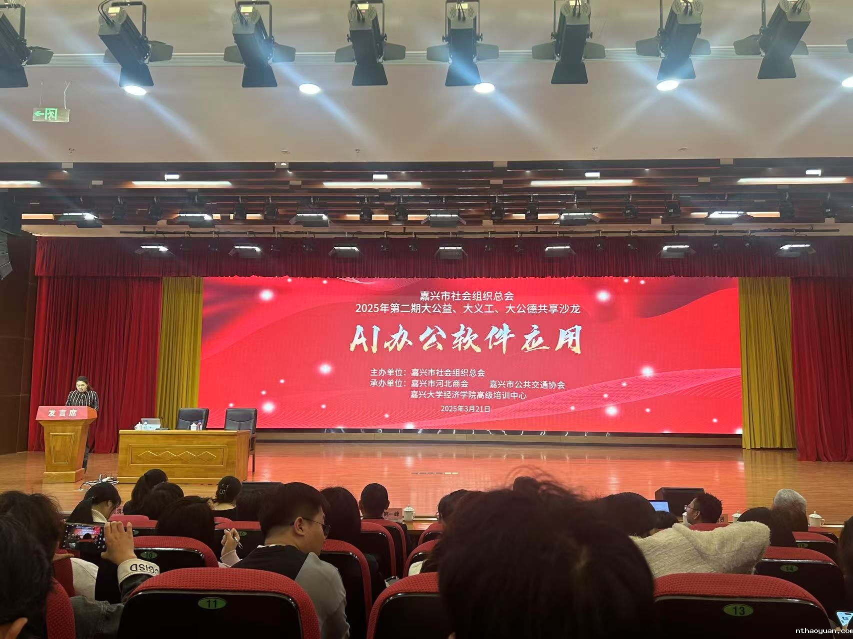 21日的 “大公益、大义工、大公德” 共享沙龙活动中,嘉兴市社会组织总会会长郑启忠发表致辞,鼓励各社会组织接纳新技术,实现 AI 技术与业务的有机融合。